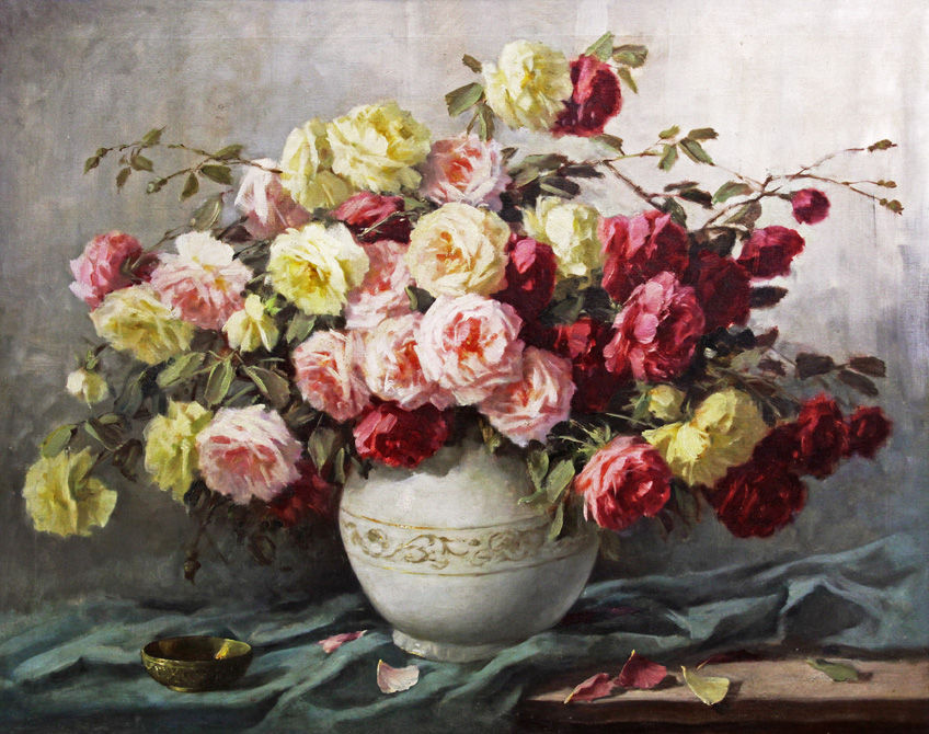 Vaso com flores vermelhas e amarelas sobre tecido (Vaso com flores vermelhas e amarelas sobre tecido) - Anita Malfatti